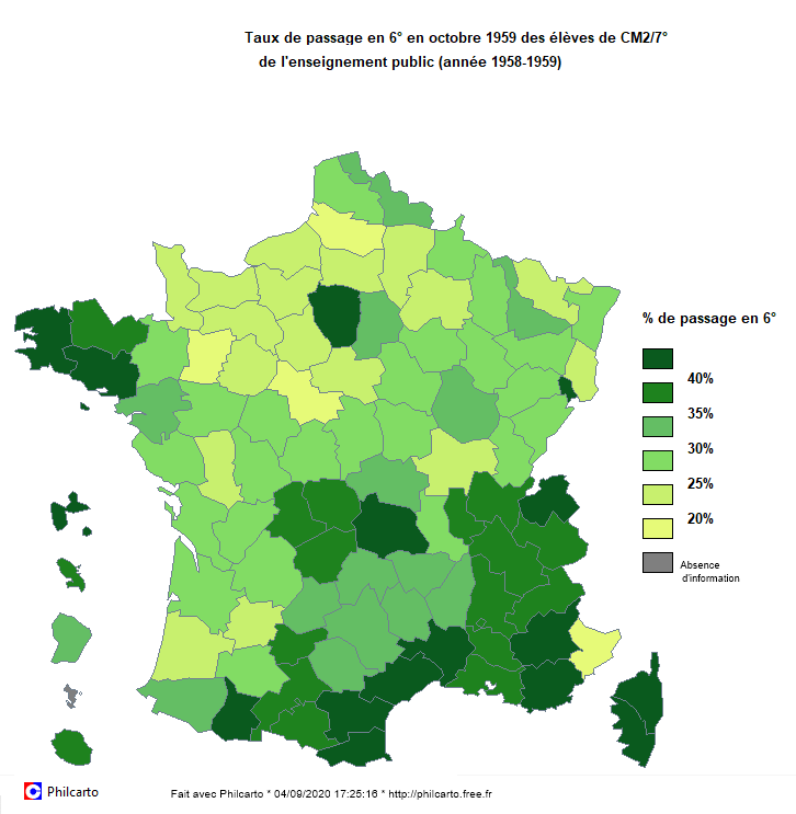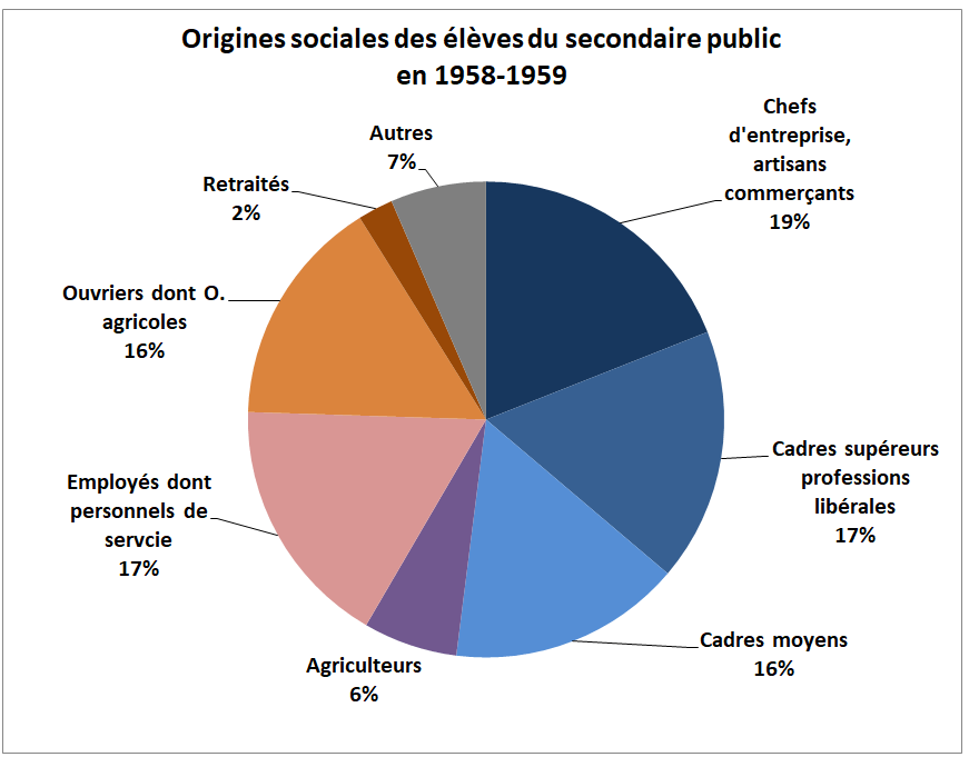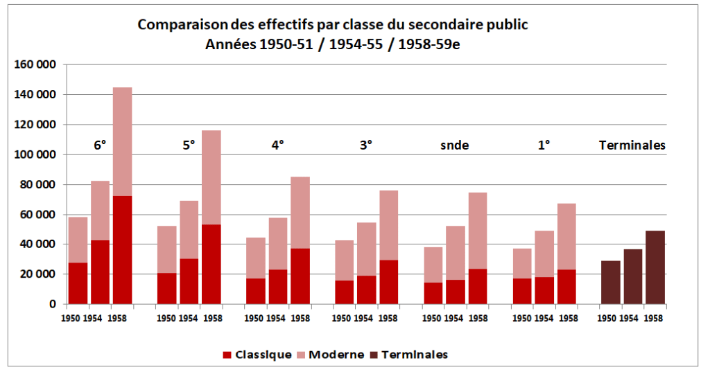 classes d’âge ont un effectif compris entre 750 000 et 820 000 jeunes, les effectifs des classes du secondaire restent très en deçà de ce niveau. En sixième de lycée en 1958, il y a moins de 150 000 élèves dans le public, soit moins de 20% des jeunes en âge de la fréquenter. L’enseignement secondaire malgré l’augmentation des effectifs reste essentiellement urbain, progressivement la part des garçons se rapproche de celle des filles du fait de l’allongement des scolarités et de moindres départs vers l’enseignement secondaire. Ceci dit il reste essentiellement urbain et fréquenté par les enfants