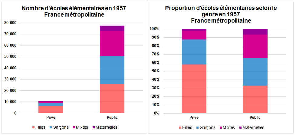 La séparation des genres est renforcée par un plus grand recours à l’école privée pour la scolarisation des filles. L’offre privée est plus importante en école de filles que de garçons, ainsi dans certaines communes de Bretagne, il n’y a pas d’écoles privées pour les garçons. Les écoles privées mixtes sont extrêmement rares .