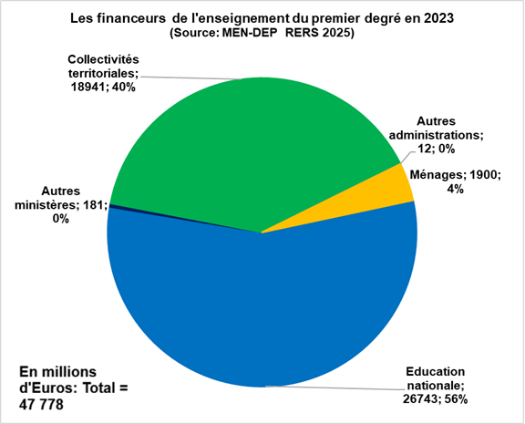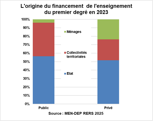 L’enseignement élémentaire public a été financé en 2023 à 96% par des fonds publics (97,5%, en 2020) : 56,4% par l’État (65,2%) et par les communes 39,6%. Le reste est apporté par par les familles (3,7%) et des organismes sociaux, des agences nationales (0,3%). La contribution des entreprises est désormais nulle. Il n’est pas certain que soient pris en compte dans cette estimation les financements indirects ou les aides matérielles fournies par des associations ou des donateurs qui aident au développement de certains projets.