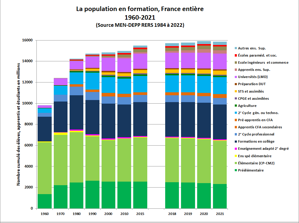 Dans le même temps la population en formation a continué de croître régulièrement à la suite d’une double évolution : une entrée de plus en plus précoce à l’école, jusqu’à ce que soit limitée la scolarisation à 2 ans, l’allongement des scolarités par la quasi-généralisation de l’entrée dans un second cycle avant l’âge de fin de scolarité obligatoire puis par l’amplification de l’accès au baccalauréat (par sa diversification) et par le développement des formations supérieures et la mise en avant du niveau bac+5 comme référence.