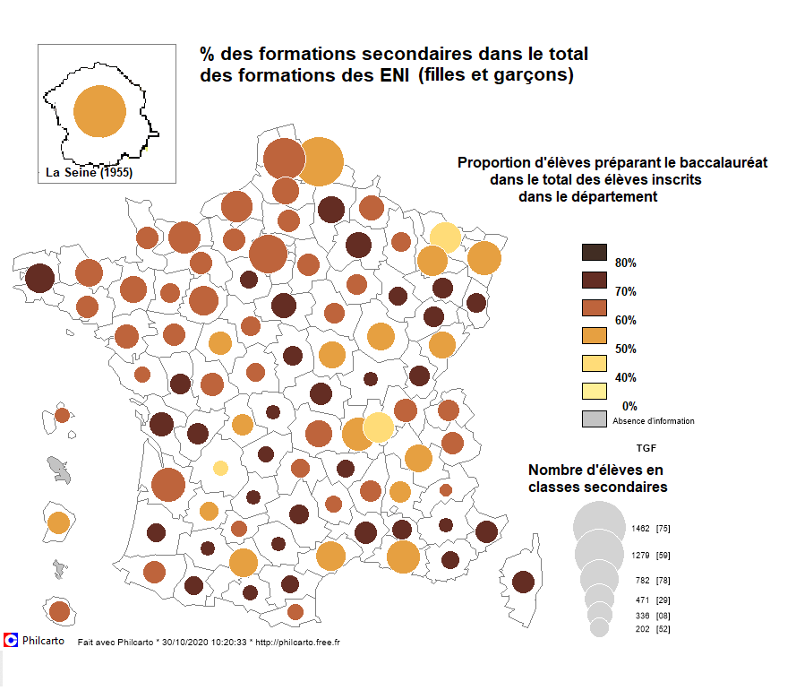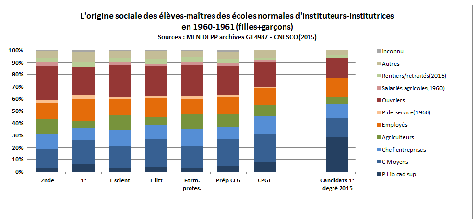 Dès 1955, tous les candidats possèdent le baccalauréat, alors qu’au XIX° et au début du XX° siècle, le brevet supérieur était le diplôme de référence. La formation par les écoles normales de filles et de garçons permet aux lauréats du concours après la troisième de bénéficier d’une bourse complète, en échange d’un engagement décennal auprès de l’État. Cela permet à des jeunes de milieux modestes de poursuivre leurs études. Au début des années 1960, les possibilités de poursuite d’études pour les élèves des écoles normales d’instituteurs ou d’institutrices sont peu nombreuses, si ce n’est pour une centaine d’entre eux (108) admis dans les classes préparatoires aux écoles normales supérieures et ceux se formant à l’enseignement bivalent en collège (827) comme professeur d’enseignement général de collège (PEGC). Même s’il s’agit d’anticiper l’application de la réforme Berthoin qui prévoit la généralisation de l’entrée en collège, l’effort de formation reste réduit et ne représente qu’un peu plus de 3% des effectifs en formation dans les écoles normales départementales.