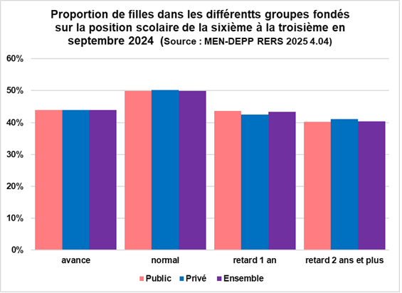 celle des garçons, du fait de la légère surnatalité masculine, on constate une sous-représentation des filles dans les groupes qui ne sont pas à l’heure (à l’âge normal). Elle est légère pour le groupe des élèves en « avance » et beaucoup plus prononcée dans celui des élèves en retard et en grand retard. Cet écart est plus appuyé dans les établissements du privé que dans ceux du public. De même, quelle que soit l’origine sociale des élèves de sixième, la proportion de filles en retard est toujours inférieure à celle des garçons. On ne peut que regretter que les données croisant la position scolaire (avance/retard) et l’origine sociale ne soit plus présente dans les tableaux de Repères et Références. Ce qui explique le maintien sans mise à jour des données de 2017 dans cette page.