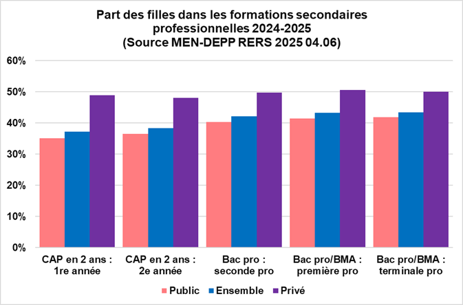 La part des filles dans les formations professionnelles n’est pas identique dans le privé et le public. Dans ce dernier, la part des filles, à l’exception des formations rares de Niveau IV et V, est toujours inférieure à celle des garçons, alors que dans le privé la présence des filles dans les différents niveaux de formation est presque toujours proche de la moitié, excepté dans les formations à effectifs réduits (CAP en 1 an, Mentions complémentaires et Niveaux V et IV hors baccalauréat professionnel). Cette différence s’explique en partie par le fait que les lycées professionnels privés ont une offre de spécialités traditionnellement plus plus centrée sur les spécialités tertiaires (secteur sanitaire et social, secrétariat…)