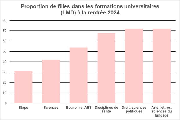 Les filles sont majoritaires dans les plupart des disciplines présentes dans les universités à l’exception des sciences et des STAPS. En sciences elles sont proportionnellement encore moins nombreuses dans les filières courtes à recrutement sélectif (STS et DUT) ainsi que dans les classes préparatoires et les écoles d’ingénieurs. Leur contribution aux doctorats est toujours inférieure à leur présence dans les licences et les masters et ne dépasse 50% que dans trois domaines : agronomie et écologie, médecine et santé, sciences humaines et humanité.