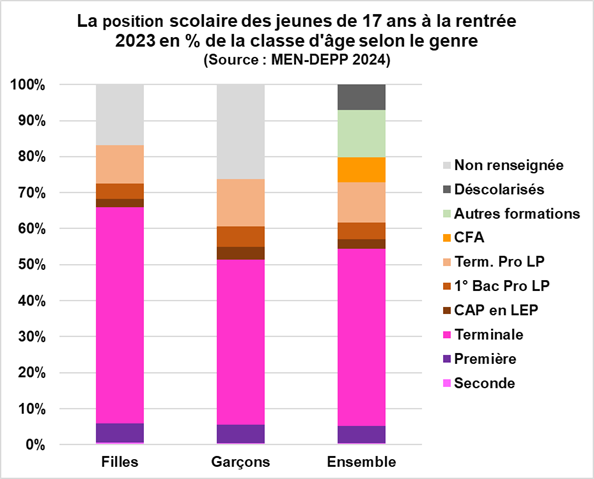 L’orientation de fin de 3ème conduit proportionnellement plus de filles dans les classes de seconde générale ou technologique et plus de garçons dans classes de seconde professionnelle. L’on pouvait jusqu’en 2024 avoir un aperçu de cette répartition inégale à travers la position scolaire à 17 ans. La nouvelle édition de Repères et références ne donne plus cette information. L’écart tient à plusieurs facteurs, la meilleure réussite des filles facilite leur accès aux formations générales, les emplois tertiaires vers lesquels elles se dirigent plus fréquemment que les garçons ne nécessitent pas une spécialisation professionnelle avant le baccalauréat. A l’inverse les garçons qui s’orientent vers les métiers de la production ont une offre de formation professionnelle plus large.