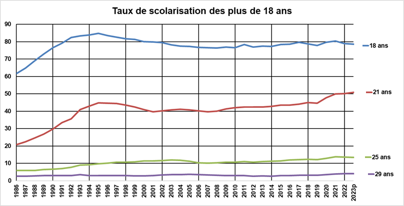 La seule évolution notable est l’augmentation de la part des personnes toujours en formation à 21 ans, qui correspond à l’incitation à atteindre le niveau bac + 5. Pour autant la proportion de personnes à poursuivre au-delà n’augmente pas aussi vite.