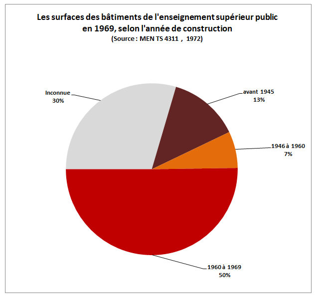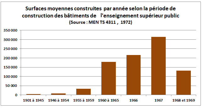 Les universités sont pour la très grande majorité de création ancienne et occupent leurs locaux historiques, si ce n’est celles qui ont été détruites pendant la Seconde Guerre Mondiale et qui sont en cours de reconstruction. Les premières grandes évolutions interviennent au début de la V° République, lorsque sont décidés en même temps, le développement de l’enseignement pré-scolaire, la généralisation du passage en 6° après le CM2, la création des collèges techniques puis des lycées technologiques et enfin des Instituts Universitaires technologiques. Toutes ses réformes nécessitent la création de nouvelles écoles et de nouveaux établissements et donc la construction de nouveaux bâtiments. En 1969, la moitié de la surface des bâtiments de l’enseignement supérieur date de moins de 10 ans et près des trois quarts a été construit depuis 1900.