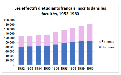 En 1960, aux environs de180 000 jeunes français sont inscrits dans les facultés, deux tiers dans les disciplines générales et un tiers dans celles de la santé (médecine, pharmacie, dentaire). Depuis la fin de la seconde guerre mondiale les effectifs ont augment