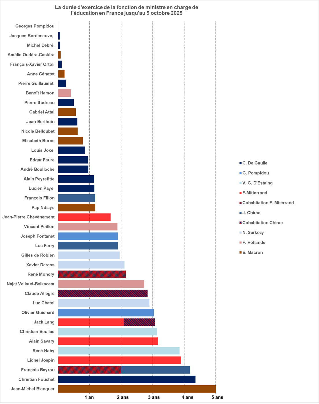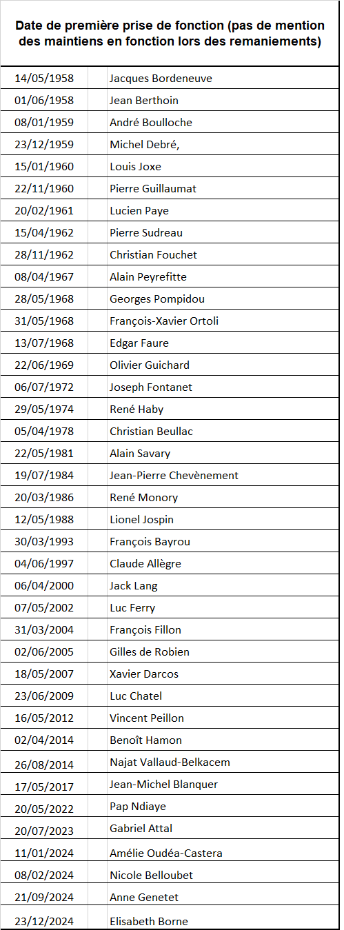 Depuis 1958, 40 personnes ont été le ministre en charge de l’éducation, sous la responsabilité de 48 premiers ministres différents. Après sa troisième nomination en juillet 2020, M. J.-M. Blanquer a rejoint François Bayrou, Lionel Jospin et Luc Chatel dans le groupe des personnes qui ont été ministre en charge de l’Éducation à trois reprises dans la durée, en conservant leur fonction lors de changements de gouvernement. Quatre ministres ont exercé dans des gouvernements de cohabitation: René Monory (1986-1988) et F. Bayrou (1993-1995) sous la présidence de F. Mitterrand, Claude Allègre (2000-2002) et Jack Lang (2002-2005) sous celle de Jacques Chirac.