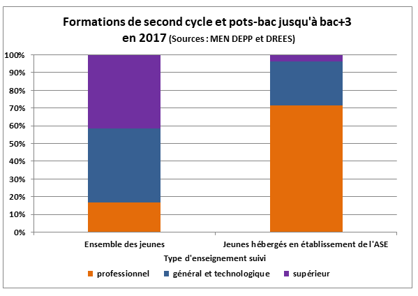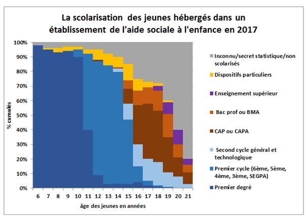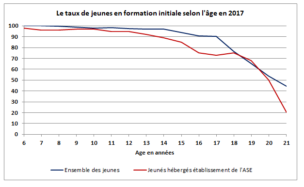 Les jeunes hébergés sous la responsabilité de l’ASE sont à presque tous les âges moins scolarisés que le reste des jeunes. Cela résulte à la fois de l’existence de difficultés découlant de la maltraitance ou du manque de soin avant leur placement, de difficultés psychologiques en raison même des causes du placement ou de son déroulement. Une part d’entre eux, plus importante que dans le reste des jeunes fréquente des structures adaptées pour faciliter la réinsertion scolaire. Jusqu’au collège la scolarisation dans les classes ordinaire est légèrement moins importante que dans les mêmes groupes d’âge. Entre 10 et 15 ans (classes de CM2 à 3°) le décrochage scolaire s’accroît. Entre 16 et 18 ans la part de jeunes engagés dans une formation secondaire reste stable (aux environs de 75% pour les jeunes de l’ASE) si bien qu’entre 18 à 20 ans, les jeunes sous protection sont proportionnellement aussi nombreux en formation que les jeunes de leur âge. Mais une fois réalisée l’obtention d’un diplôme les sorties de formation s’accélèrent. L’année de leurs 21 ans ils sont 2 fois moins nombreux en formation. La source ne permet pas d’évaluer la proportion de jeunes majeurs issus de l’ASE obtenant un diplôme de l’enseignement supérieur, mais elle ne peut être que minime.
