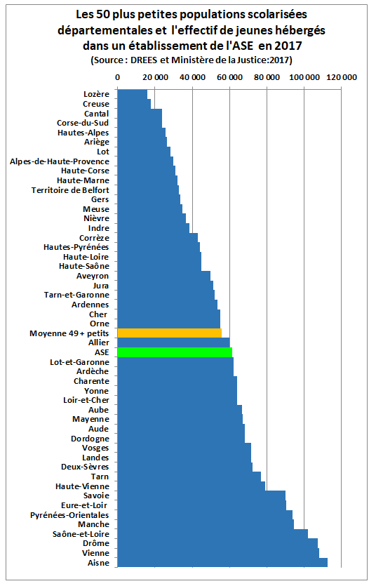 En 2017, selon le contenu d’un rapport publié en mai 2020, aux environs de 300 000[1] enfants et jeunes majeurs bénéficiaient d’au moins une mesure ou prestation de protection, dont environ la moitié consistait en un placement, en famille d’accueil (aux environ de 90 000) ou en établissement de l’Aide Sociale à l’Enfance ASE (environ 65000). Leurs scolarités, au moins jusqu’au placement, a été souvent perturbée, elle le reste au rythme des changements de familles d’accueil ou d’institution. Les données relatives à leur scolarité à partir de 6 ans ne font l’objet d’une collecte permettant d’analyser leurs parcours scolaires que lorsqu’ils sont hébergés dans un établissement des services d’aide sociale à l’enfance (ASE). Les données ne sont pas communiquées pour les enfants placés en famille d’accueil.es jeunes appartenant à ce groupe d’âge (6-21 ans) placés par décision de justice sous la protection des services départementaux étaient au nombre de 61 400 en 2017.Cela ne représente qu’un cinquième des jeunes protégés par décision de justice.Mais cet effectif correspond peu ou prou à la population scolarisée d’un département rural. L’on ne peut certes établir une comparaison stricte puisque la population scolarisée recensée par le Ministère de l’Éducation nationale dans chaque département regroupe l’ensemble des jeunes scolarisés ou en formation à partir de 2 ans et jusqu’à leur sortie de formation. Pour la population étudiée il nous manque les moins de six ans et les plus de 21 ans. Ceci dit, l’effectif considéré est proche de celui des jeunes résidant dans un département tel que le Lot-et-Garonne, l’Ardèche, la Charente, l’Yonne, le Loir-et-Cher ou l’Aube la même année. Quantitativement cela permet d’établir des comparaisons significatives (qui ont du sens) avec les moyennes françaises. Ce qui correspond à la moyenne que la population scolarisée des 49 départements métropolitains les moins peuplés.